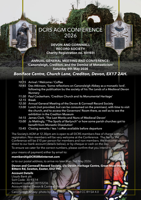 or to our postal address, to arrive no later than Saturday 2nd May : Devon and Cornwall Record Society, c/o Devon Heritage Centre, Great Moor House, Bittern Rd, Sowton, Exeter, EX2 7NL.